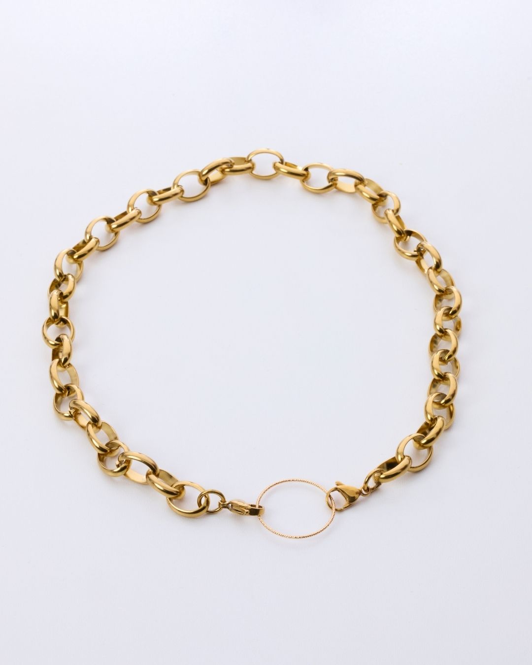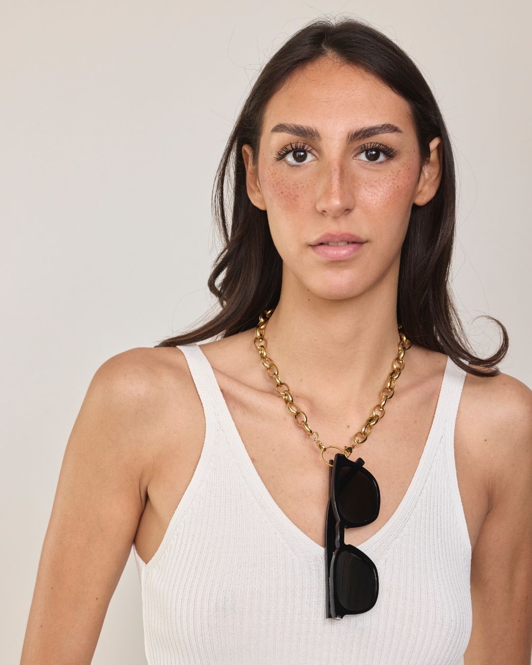 Imposante et audacieuse, cette chaîne dorée aux gros maillons affirme votre style avec confiance. Elle habille instantanément un col de chemise, un t-shirt blanc ou une robe noire.. Portez-la seule en pièce forte ou associez-la à d'autres colliers plus fins pour un effet superposé ultra tendance. Son anneau central discret permet d’y glisser vos lunettes avec style, tout en conservant l’esthétique d’un collier graphique et féminin. Chaque collier est livré avec deux anneaux de tailles différentes, pour s’adapter à toutes les montures.
