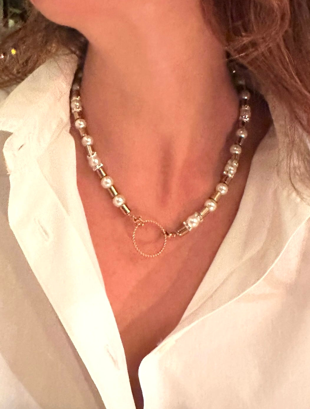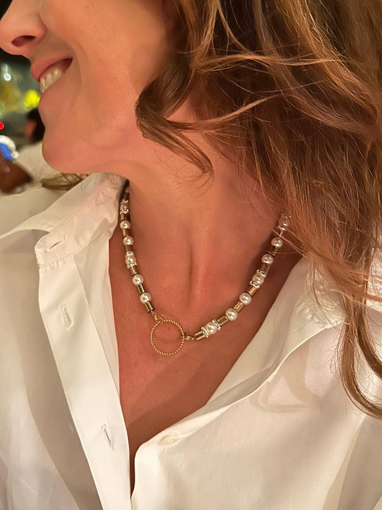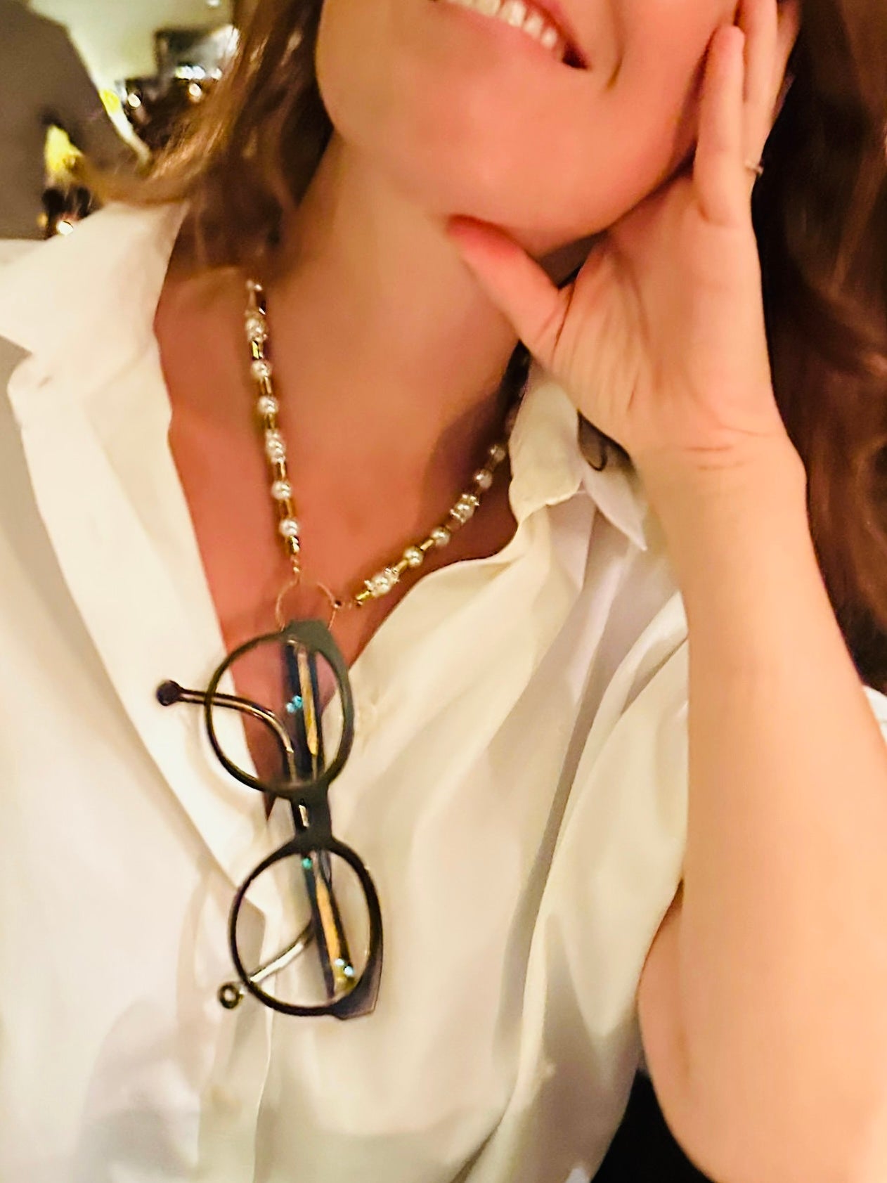 Ce collier de perle d eau douce et hématite doré , un mélange d élégance et modernité . Toujours avec un anneau pour accrocher vos lunettes .