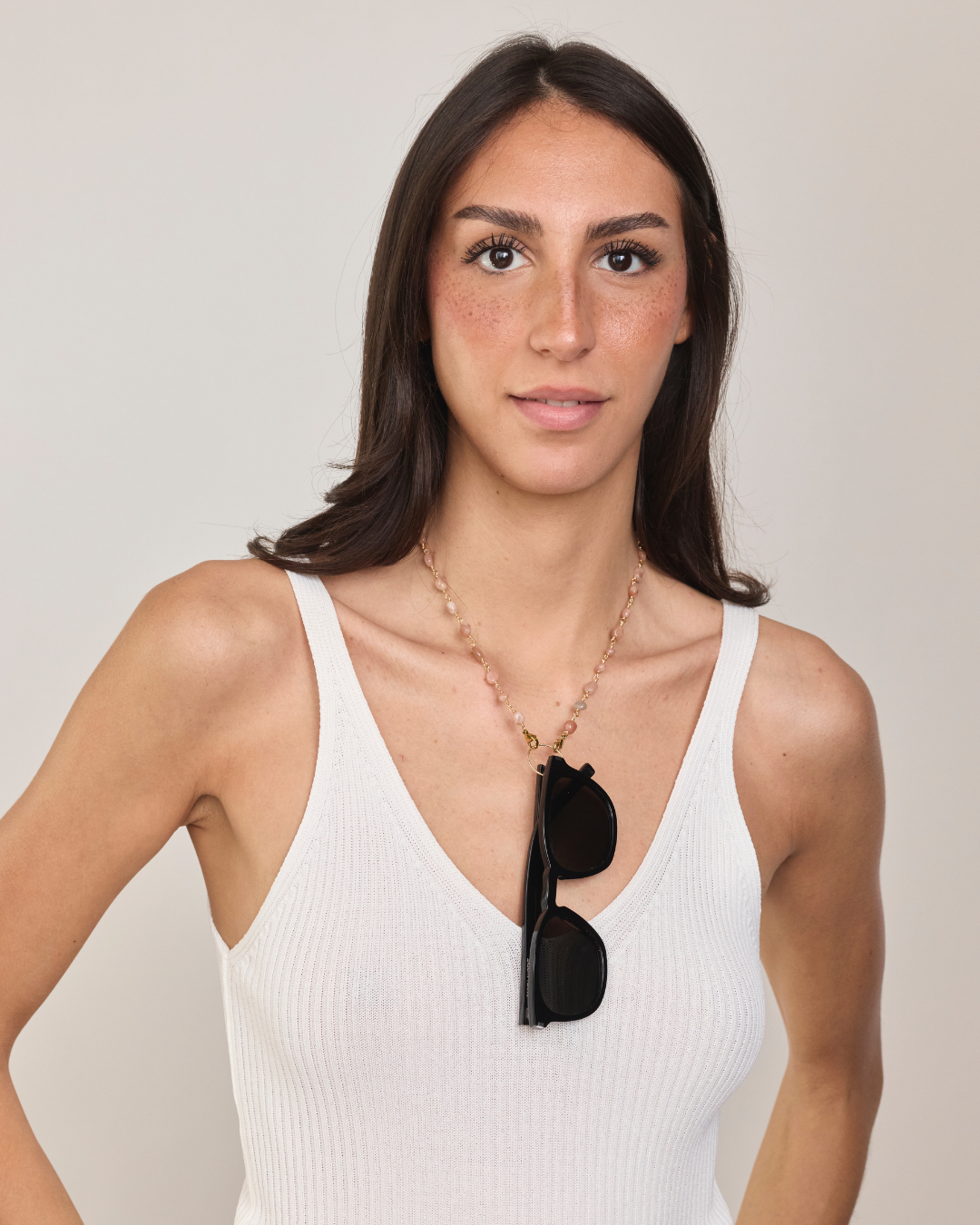 Ce collier raffiné en perles rosées allie féminité et fonctionnalité. Son design élégant met en valeur la finesse des perles, délicatement assemblées sur une chaîne dorée. À l’avant, un anneau discret et doré vous permet d’accrocher vos lunettes de vue ou de soleil, pour les garder toujours à portée de main sans compromettre votre allure. Polyvalent et pratique, il se porte aussi bien au quotidien qu’en soirée, apportant une touche d’élégance à toutes vos tenues. Chaque collier est livré avec deux anneaux de tailles différentes afin de s’adapter à toutes les montures.