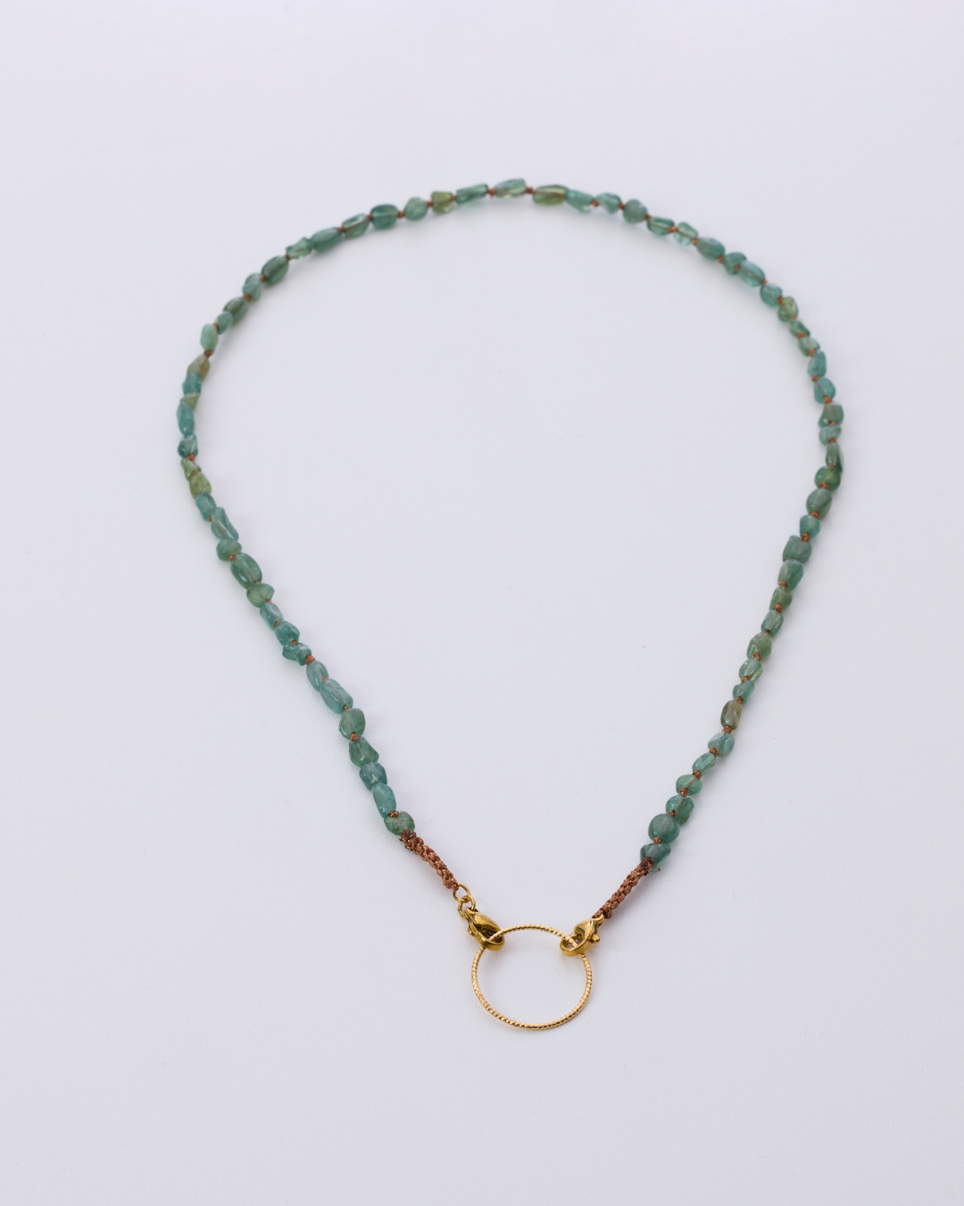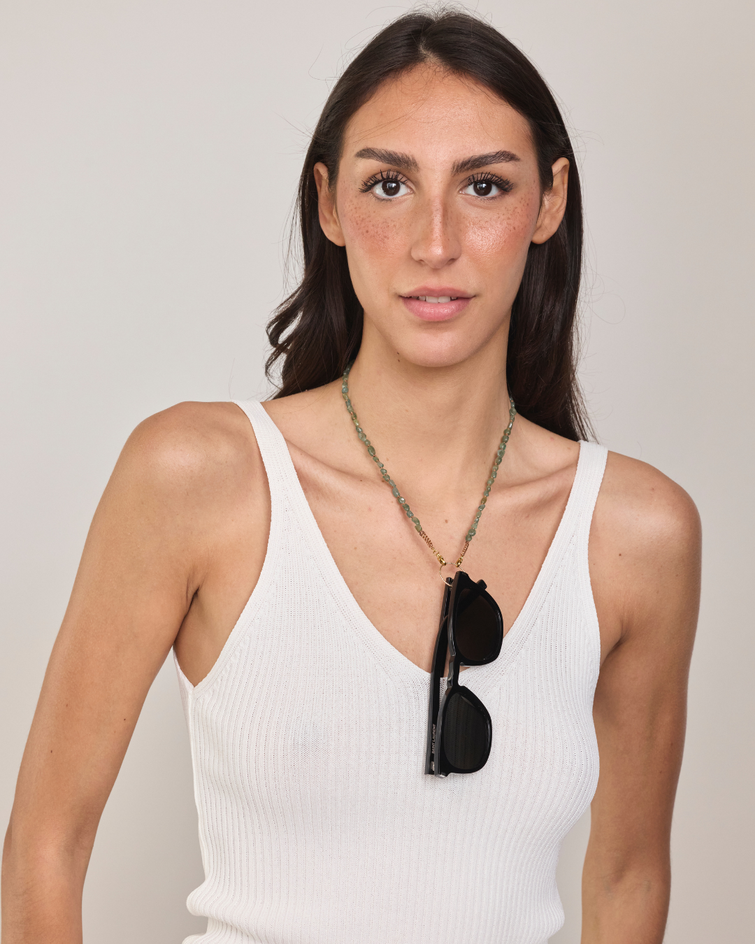 Ce collier délicat en perles vert d’eau allie élégance intemporelle et praticité au quotidien. Conçu avec un anneau discret à l’avant, il permet d’y glisser vos lunettes de vue ou de soleil tout en les gardant toujours à portée de main, sans sacrifier votre style. Chaque collier est livré avec deux anneaux de tailles différentes, pour s’adapter à toutes les montures.
